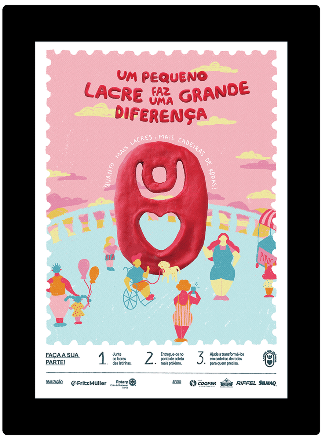 A campanha Lacre Solidário é parte de uma evolução em que o design amplia impacto e arrecadações. O gesto de juntar lacres de alumínio se transformou em movimento coletivo, convertendo-se em cadeiras de rodas para quem precisa. Nesta edição, o diferencial está na linguagem visual lúdica e acessível: um lacre gigante e títulos em massinha de modelar que conectam com crianças e famílias, gerando proximidade emocional. Ilustras digitais em estilo de giz reforçam empatia e convidam diferentes idades a participar.
